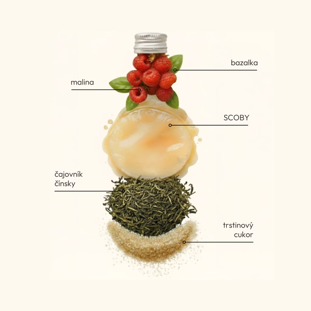 Malina Bazalka (330 ml) je nealkoholický fermentovaný nápoj nové generace. Sladká malina a aromatická bazalka se spojují do odvážné kombinace, která přináší svěží a nezaměnitelnou chuť. Bez pasterizace. Bez aromat. Bez kompromisů. Jen čistá chuť přírody, aktivní probiotika a minimum cukru – ideální volba pro ty, kteří chtějí zažít odvážné osvěžení.