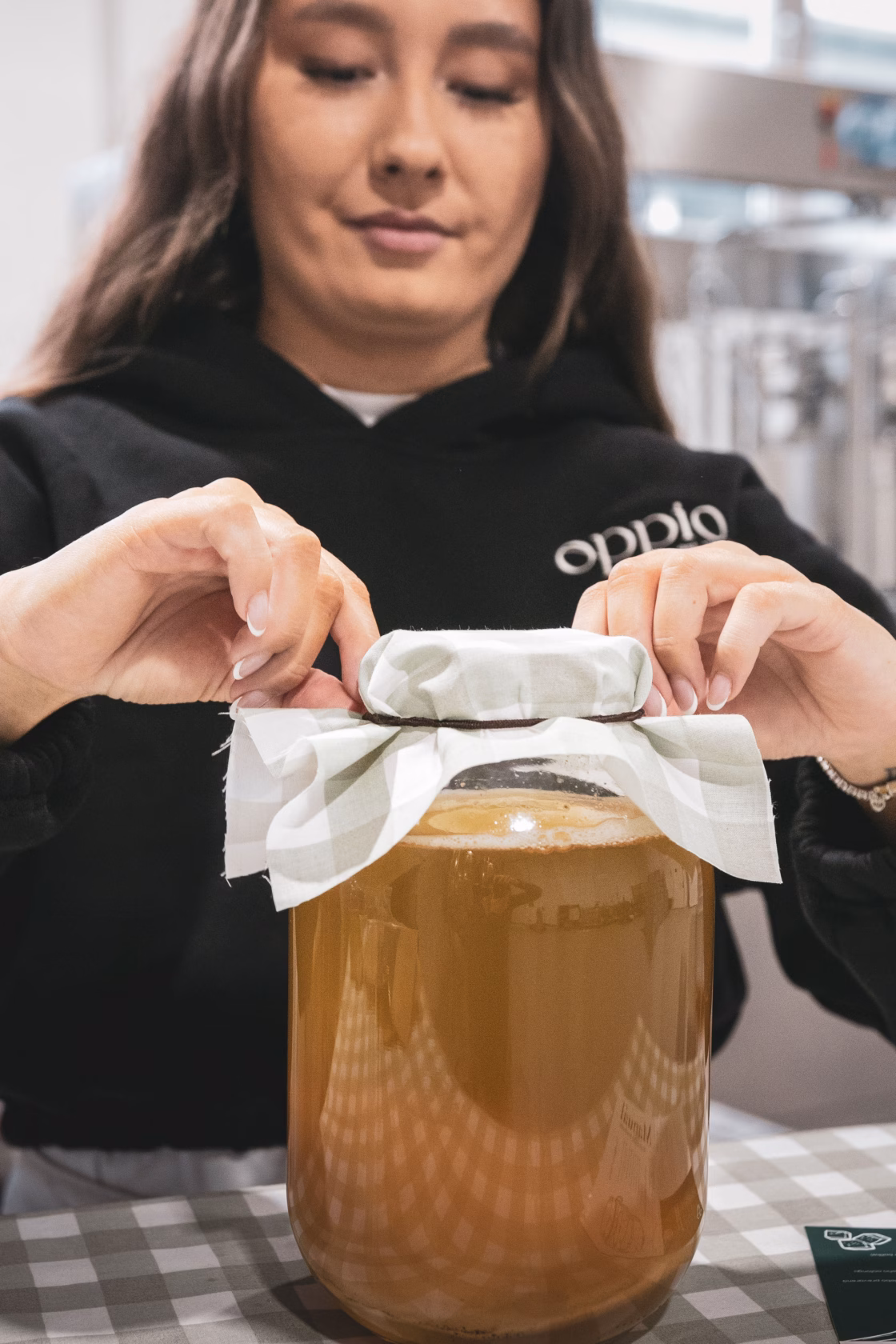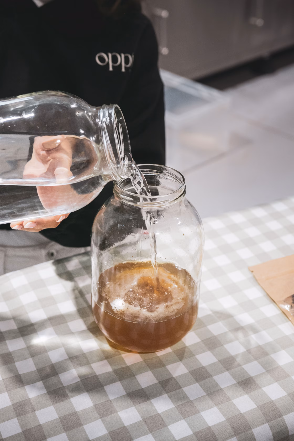 Cukr je energie, která spustí fermentaci – díky němu se tvůj čaj promění v něco živého.Nech vychladnout a vlož kulturu SCOBY spolu s trochou startovací kombuchy. Tady začíná kouzlo – mikroskopický svět bakterií a kvasinek se probouzí k životu.